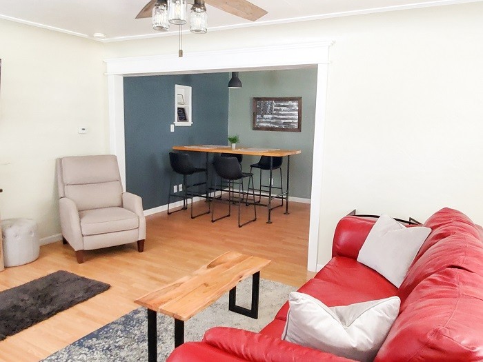 The American Oak Cottage side of the duplex offers one king-size bed and one full-size bed. It also has a full bathroom, quality kitchen appliances with plenty of dishes and cookware, two AC units, ceiling fans in every room, two TVs for streaming your favorites, fast WiFi, coffee and tea, and all the amenities you may need. You will find a grill, washer/dryer, and cleaning supplies in the garage. A front patio provides an opportunity for al fresco dining.