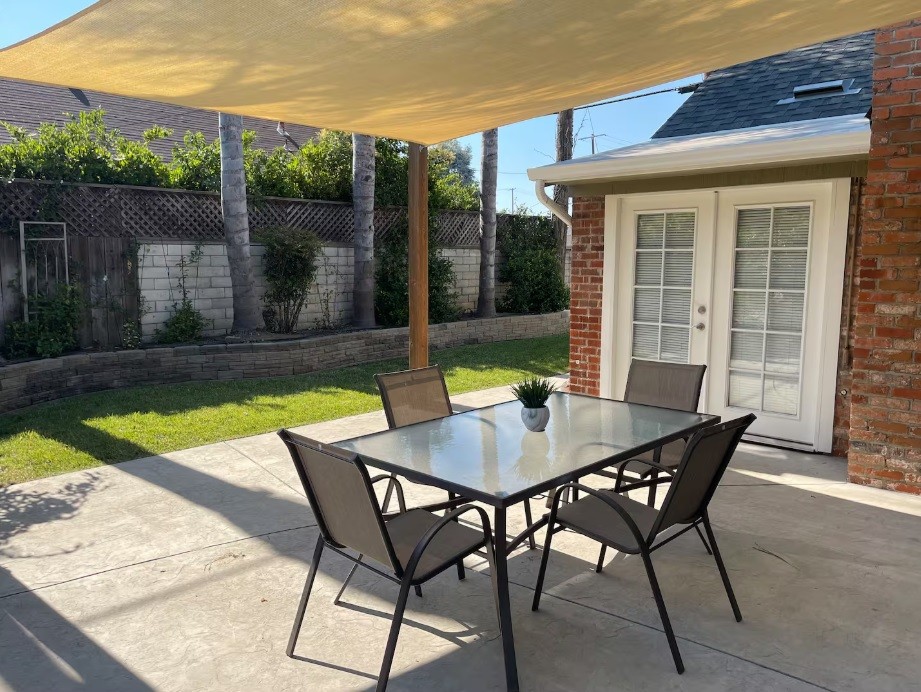 Step outside to a private, fully fenced yard with a covered patio and dining table ready for al fresco meals. Palm trees line the backyard, adding a breezy, vacation ready vibe that pairs perfectly with a glass of Lodi wine in hand.