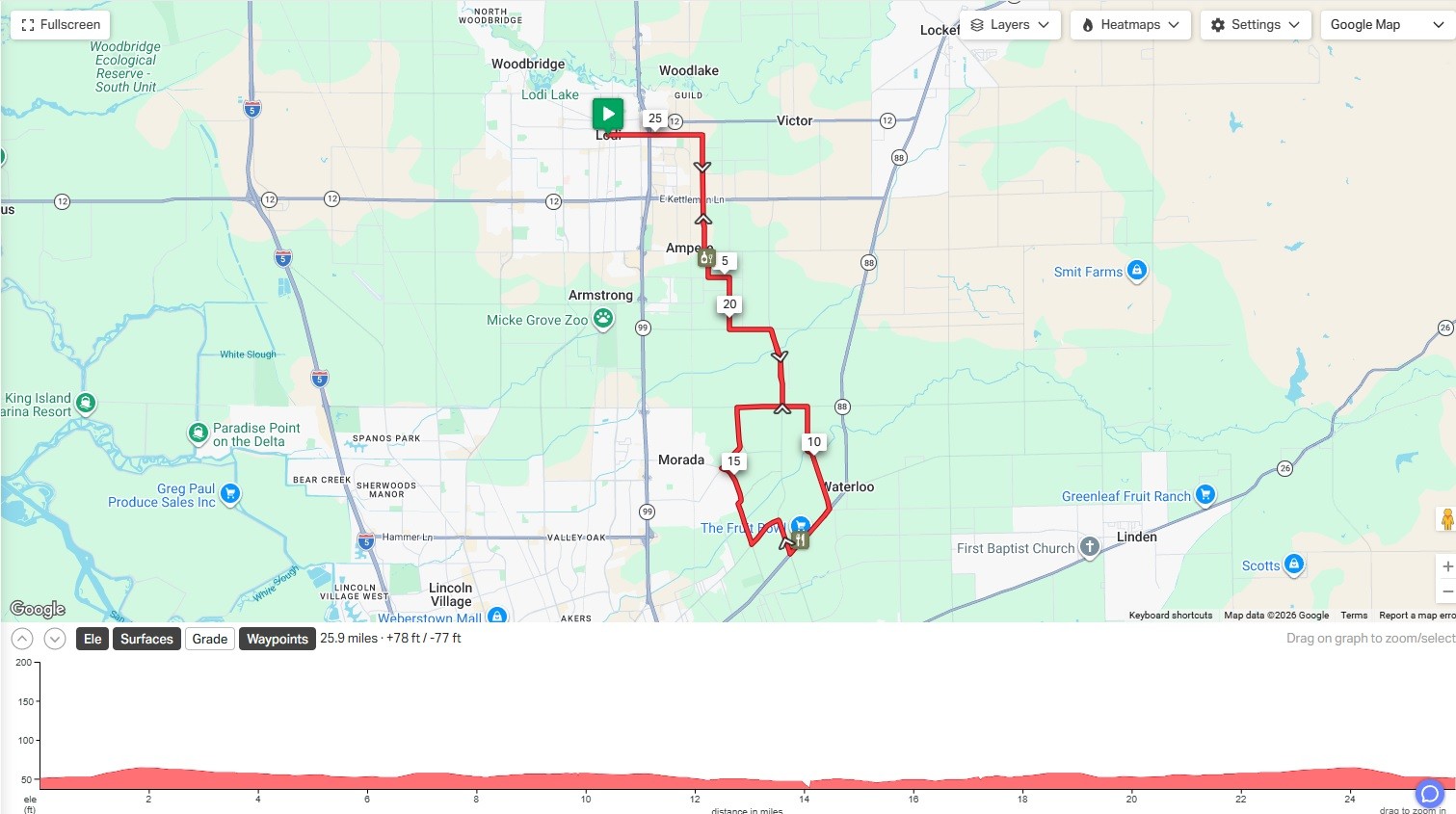 *Caution: You will be riding primarily on country roads with no bike lanes. Please ride responsibly and pull off the road to let large farm machinery pass safely. The routes in this map are provided as a representation of routes commonly used by local riders. No representation is made that they are safe from vehicular, animal, or road hazards. Users are cautioned to exercise judgment. Users assume all risks of riding bikes on the routes and agree to release hold harmless Visit Lodi! from any and all injuries or damages incurred as a result of riding on the routes.