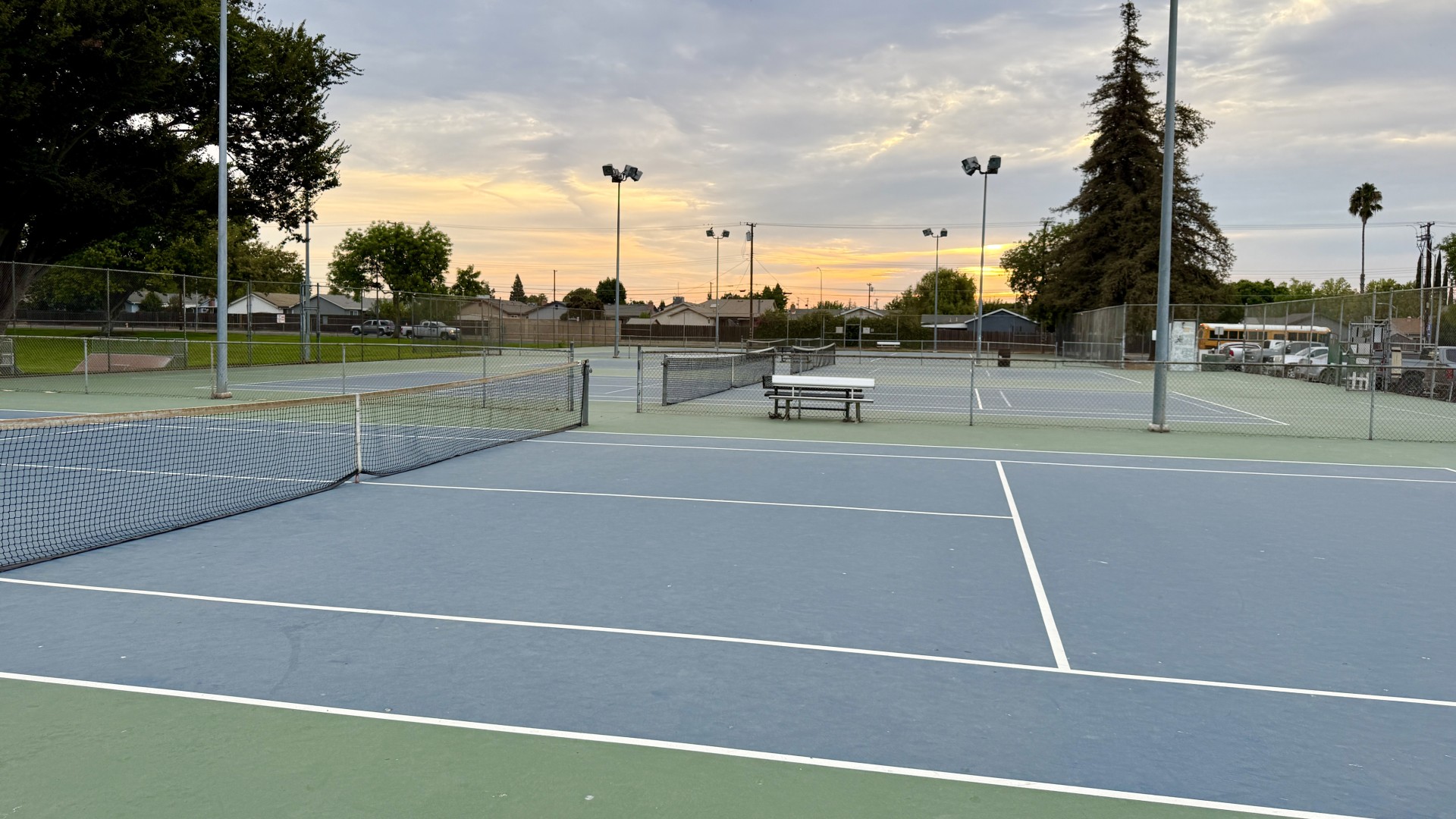 - Four overlaid pickleball courts (hard surface, permanent lines; players bring their nets)