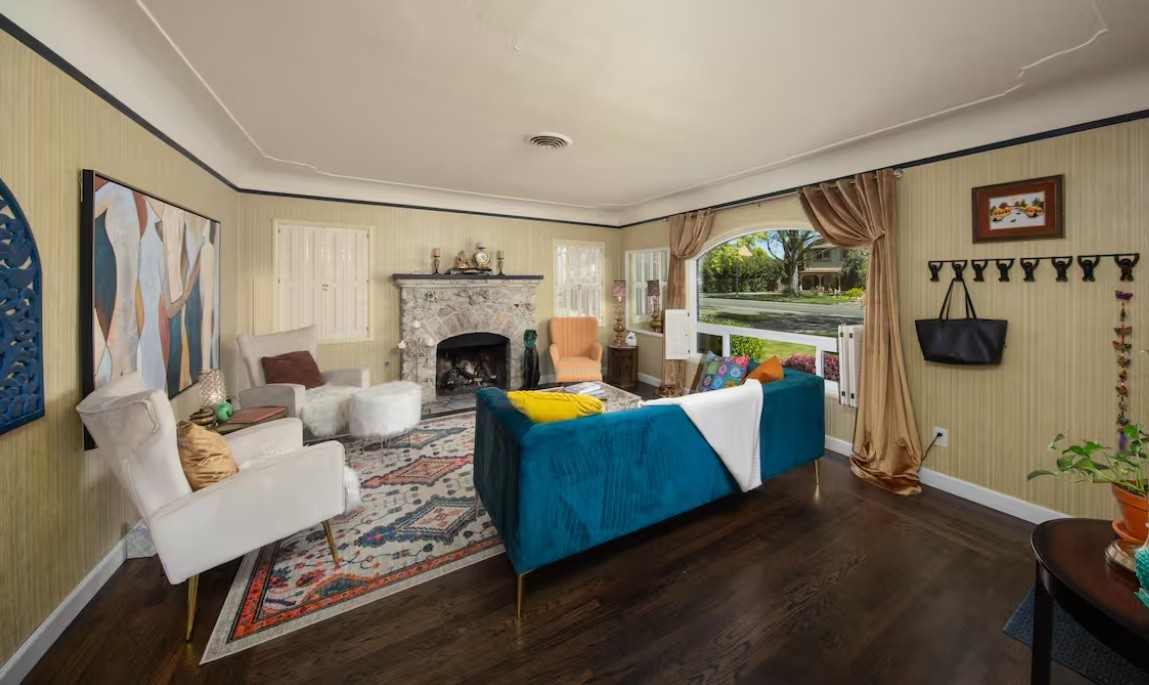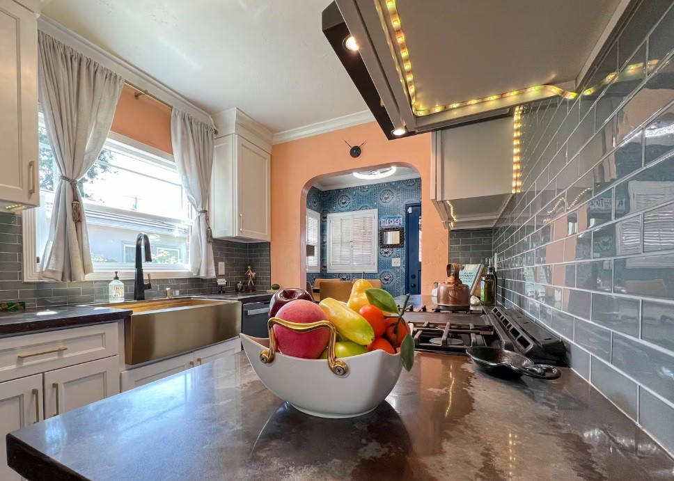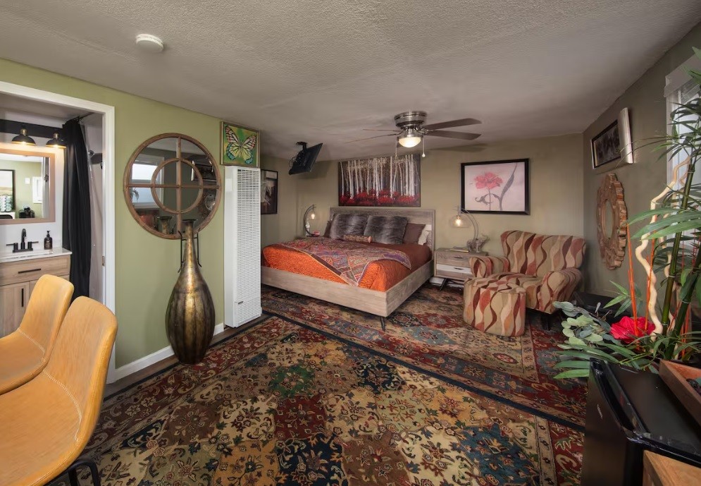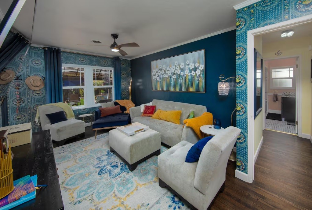 Inside, the home wraps you in warmth while bold art and bright, eclectic furnishings keep things fresh and energizing. It is comfortable, character filled, and anything but cookie cutter.