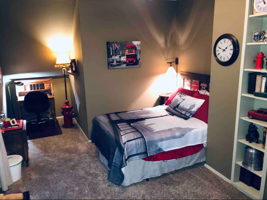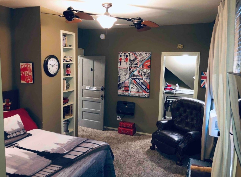 This uniquely styled space celebrates classic British décor with a cozy, comfortable vibe. It features a full size bed, a dedicated work area with chair, lamp, and surge protector, plus a bedside phone charger and a white noise machine for lighter sleepers.