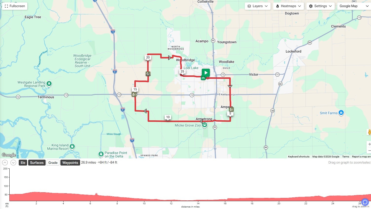 *Caution: You will be riding primarily on country roads with no bike lanes. Please ride responsibly and pull off the road to let large farm machinery pass safely. The routes in this map are provided as a representation of routes commonly used by local riders. No representation is made that they are safe from vehicular, animal, or road hazards. Users are cautioned to exercise judgment. Users assume all risks of riding bikes on the routes and agree to release hold harmless Visit Lodi! from any and all injuries or damages incurred as a result of riding on the routes.