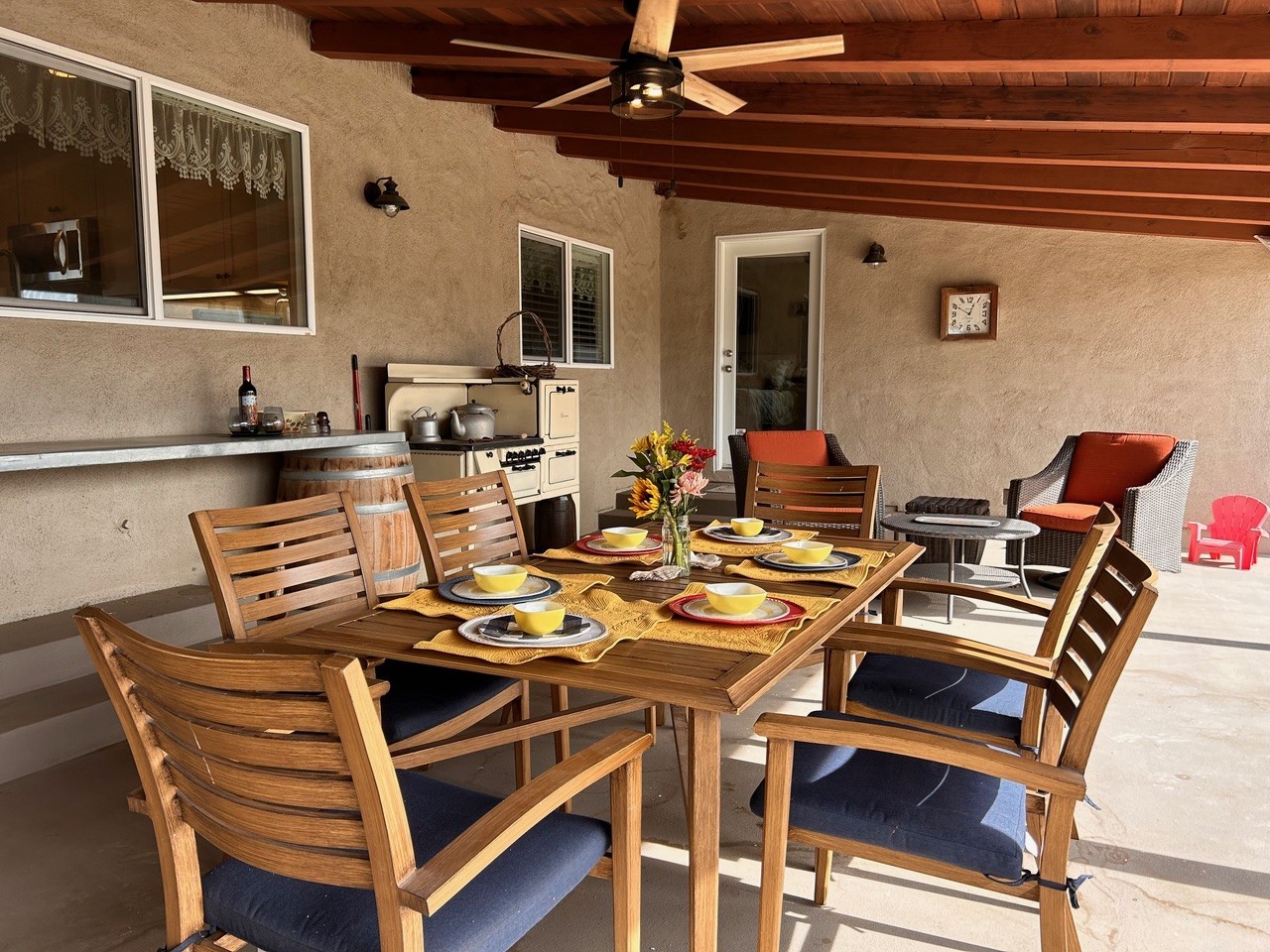 Unwind in the open-plan living area by the wood-burning fireplace or step onto the expansive covered patio to watch the sun set over the vineyards. Enjoy streaming your favorites on the Smart TV with Roku and stay connected with complimentary Wi-Fi.