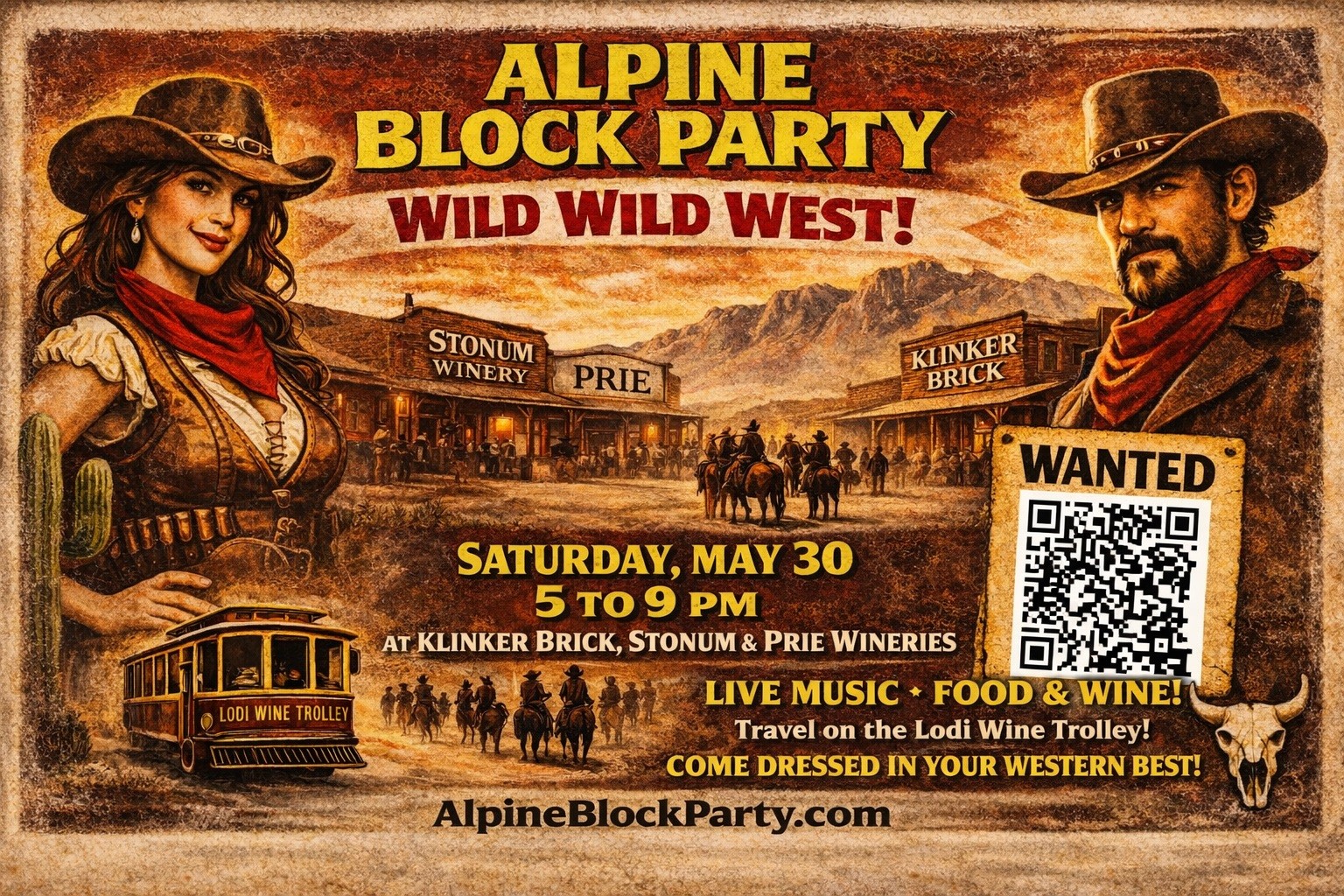 Saddle up for Alpine Block Party 2026: WILD, WILD WEST! — ridin’ back into Lodi wine country bigger, bolder, and more boot-stompin’ than ever.