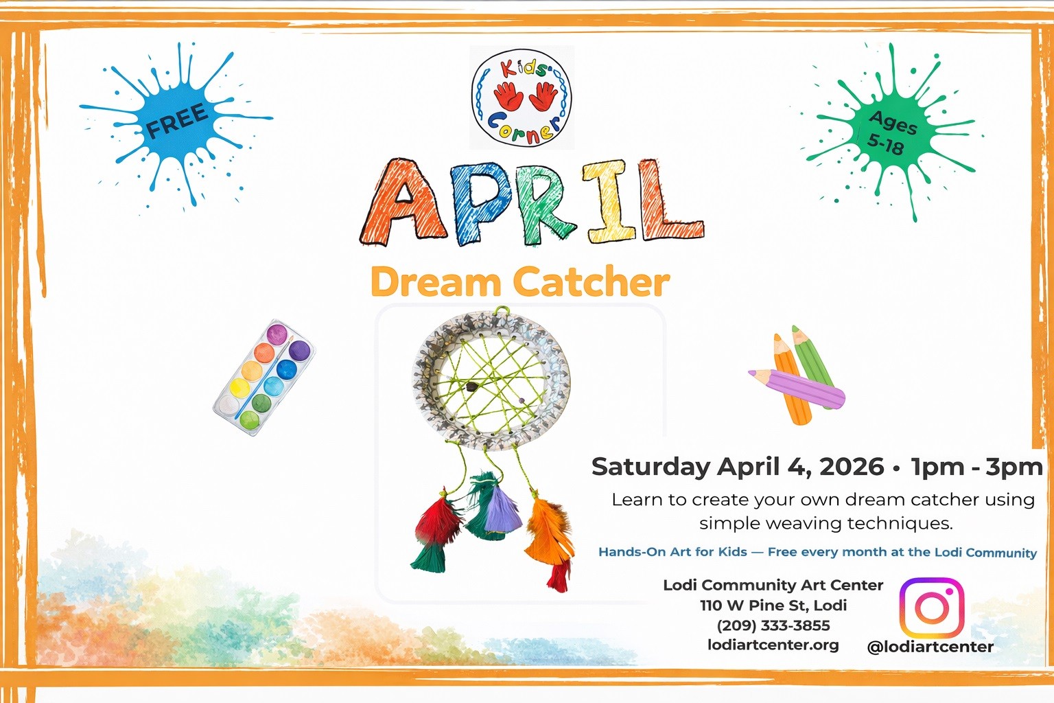 Get creative this April at the Lodi Community Art Center with a fun, hands-on art activity designed just for kids. During this Kids Corner session, young artists will learn simple weaving techniques while creating their very own dream catcher to take home.