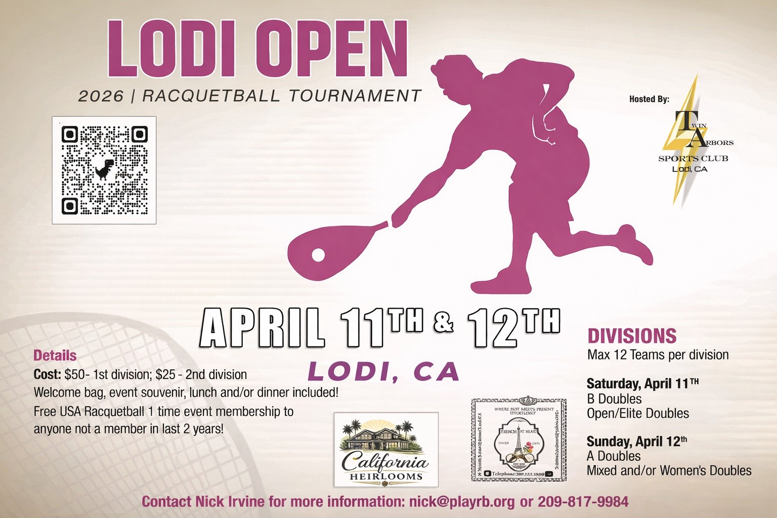 Plan your spring visit to Lodi and experience a weekend of competitive racquetball, local hospitality, and Central Valley charm.