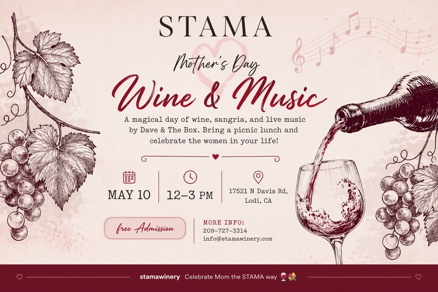 Celebrate Mother’s Day with a relaxing afternoon at STAMA Winery, where great wine, live music, and scenic surroundings set the tone for a memorable day.