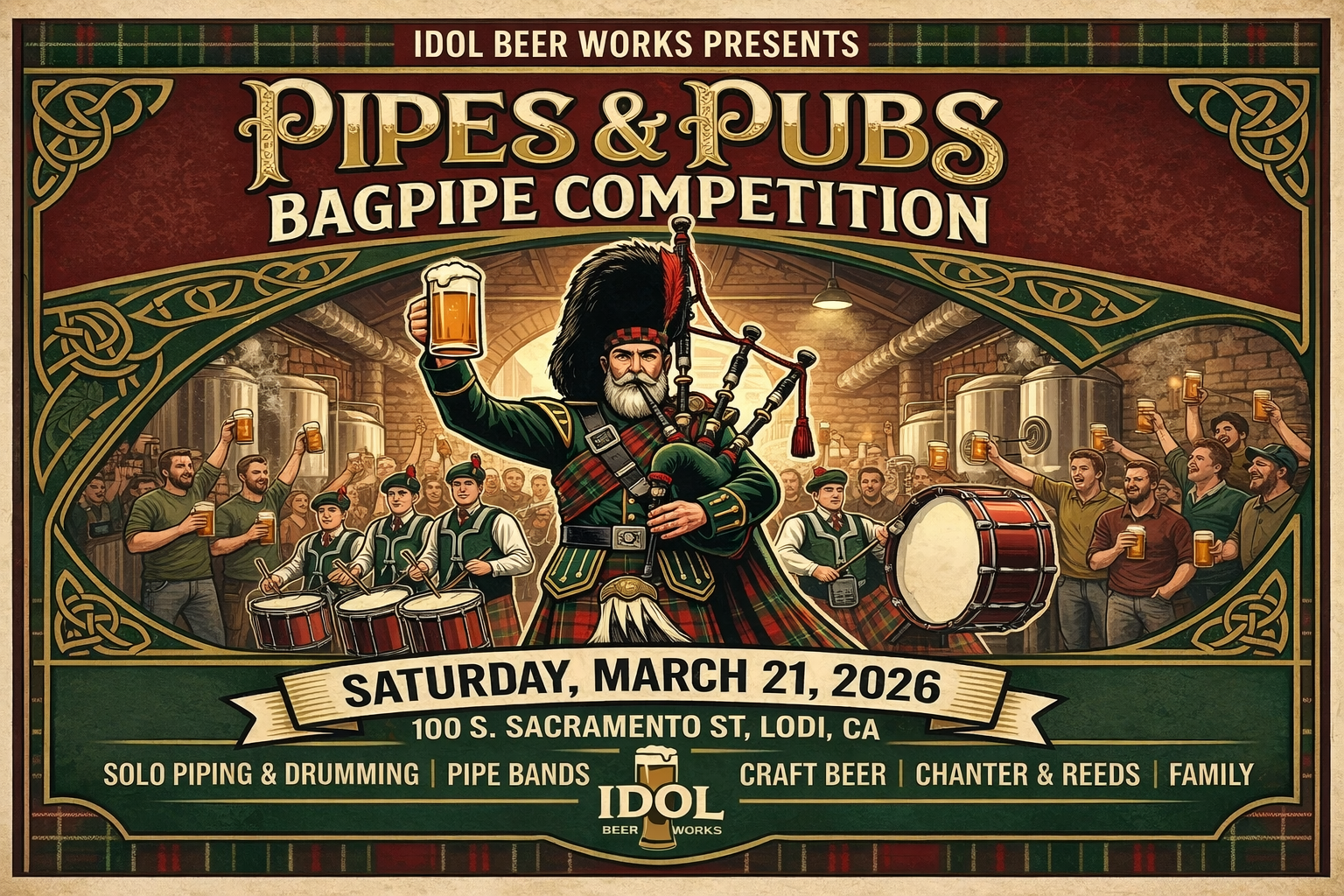 Bagpipes and craft beer come together at Pipes & Pubs, a one-of-a-kind bagpipe competition hosted at IDOL Beer Works in downtown Lodi. This lively March event blends the powerful sound of traditional Scottish music with the relaxed, pub-style vibe of a local brewery.