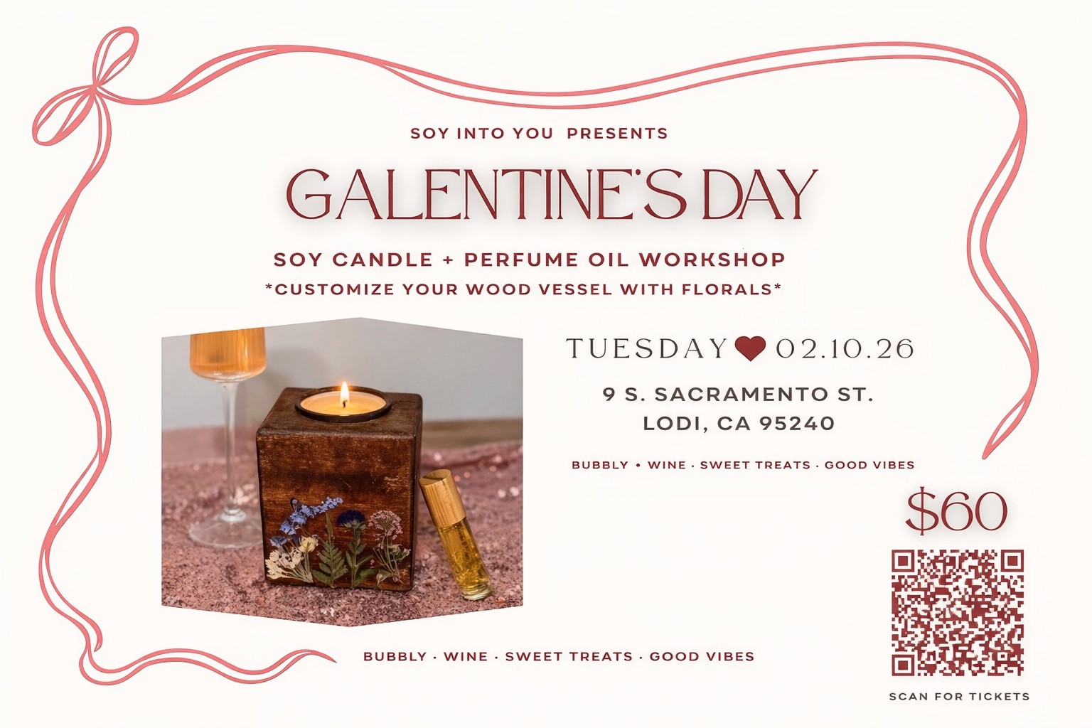 Celebrate friendship and creativity at this hands-on Galentine’s Day workshop in downtown Lodi. Guests will create a custom soy candle and perfume oil, personalized in a beautiful wood vessel with floral accents—perfect for a night out with friends.