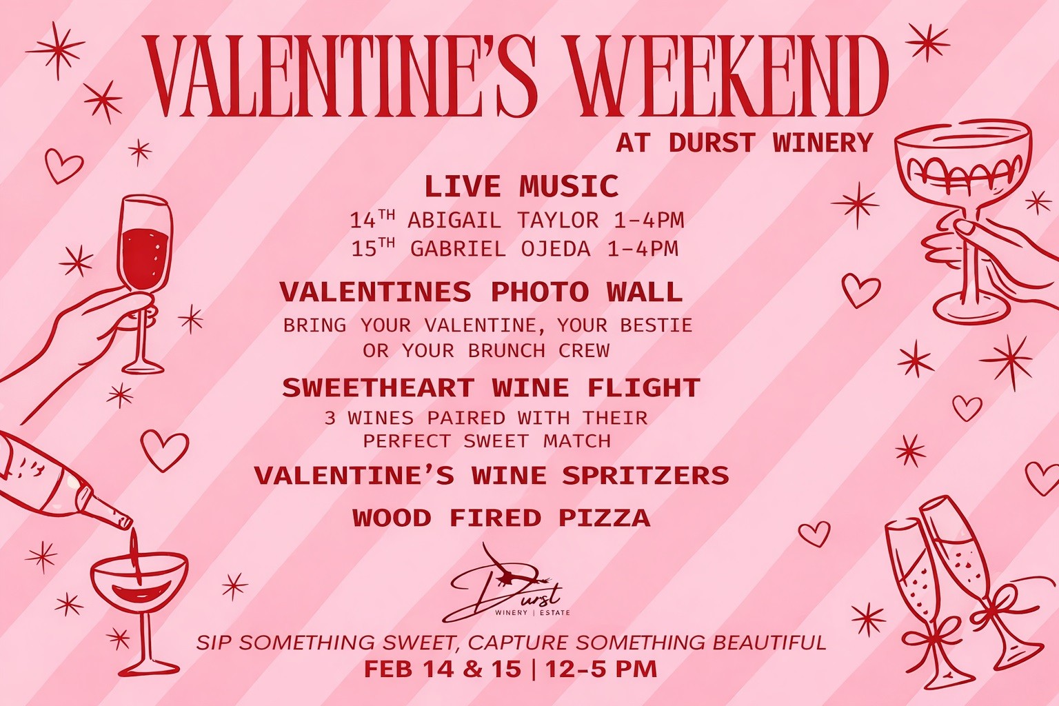 Celebrate Valentine’s Weekend with wine, music, and sweet moments at Durst Winery & Estate. Bring your valentine, your bestie, or your favorite brunch crew and enjoy a festive weekend filled with live music, wine specials, and delicious bites.