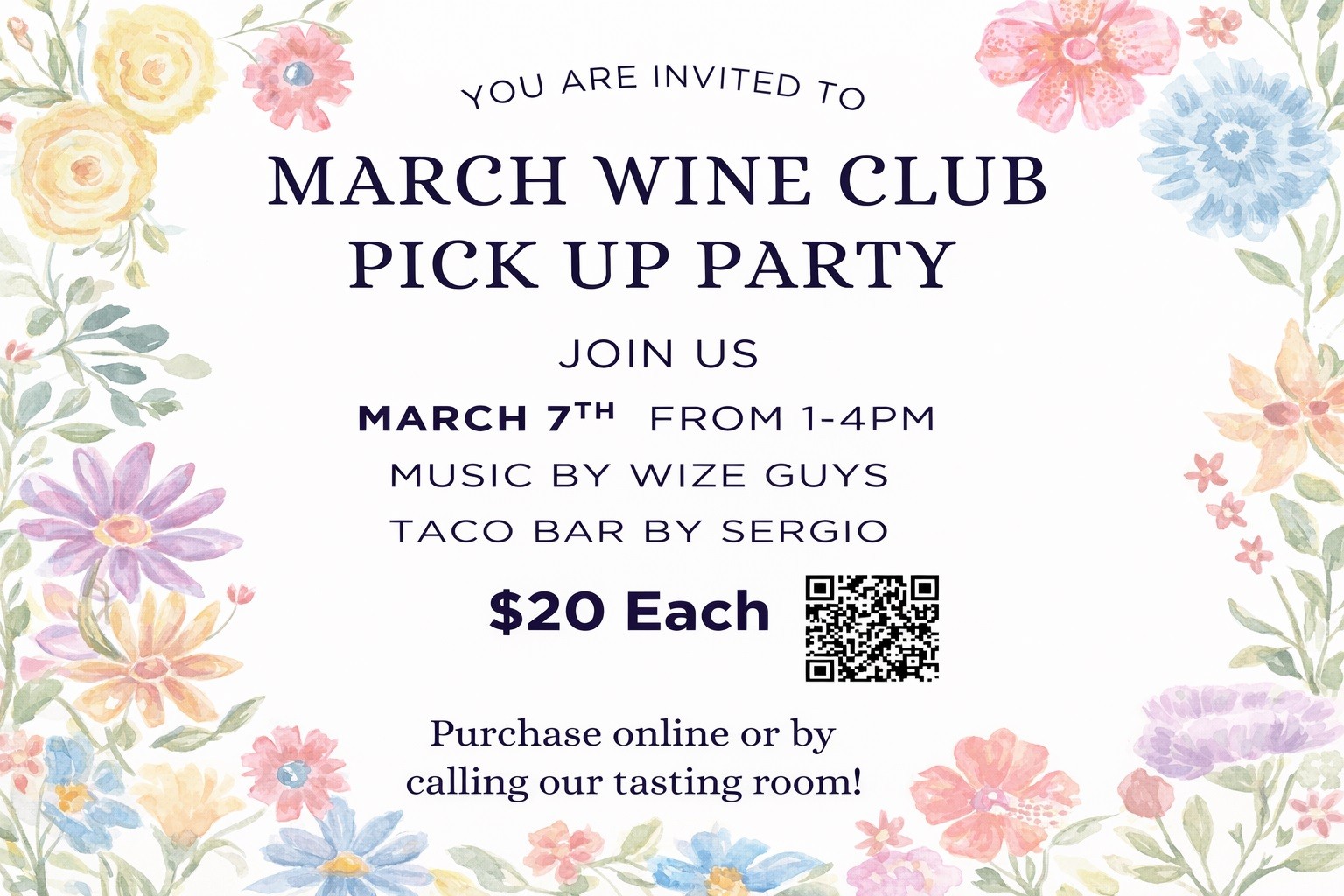 Celebrate the season and pick up your latest wine club selections at our March Wine Club Pick Up Party! Join us for an afternoon of great wine, live music, and delicious bites in a festive, welcoming atmosphere.